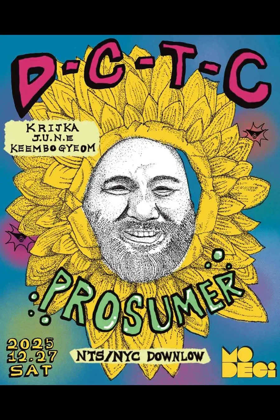 PROSUMER KRIJKA J.U.N.E KEEMBOGYEOM Artwork by @slowkid Open 10pm Entrance fee Presale ticket 10,000krw (@modeci_seoul bio) At door 20,000krw PROSUMER (NTS / NYC Downlow)