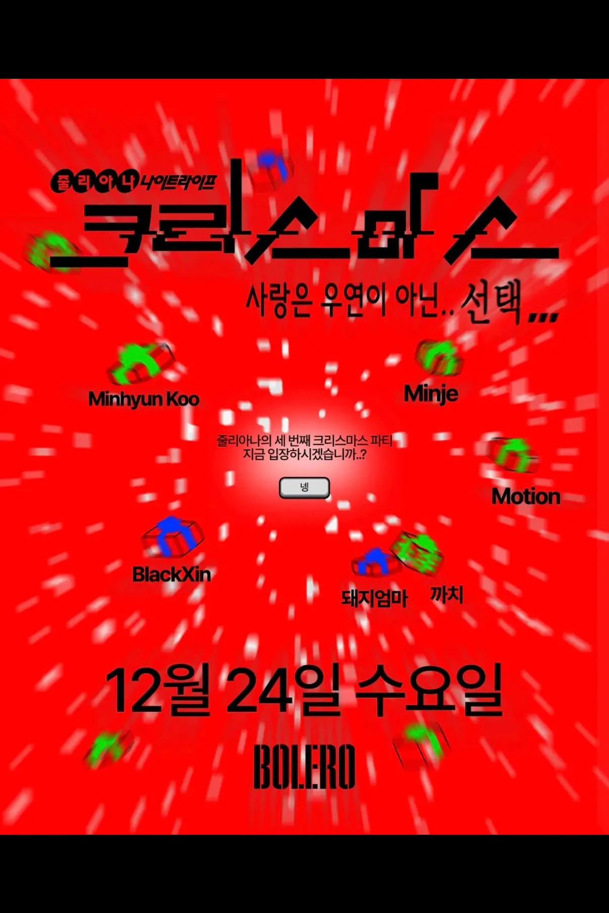 크리스마스 이브의 밤을 축하하기 위해 줄리아나가 @boleroseoul에 출격합니다. 우리는 늘 선택의 기로에 서있조. 여러분은 이번 크리스마스에 어떤 계획을 갖고 계신가요?