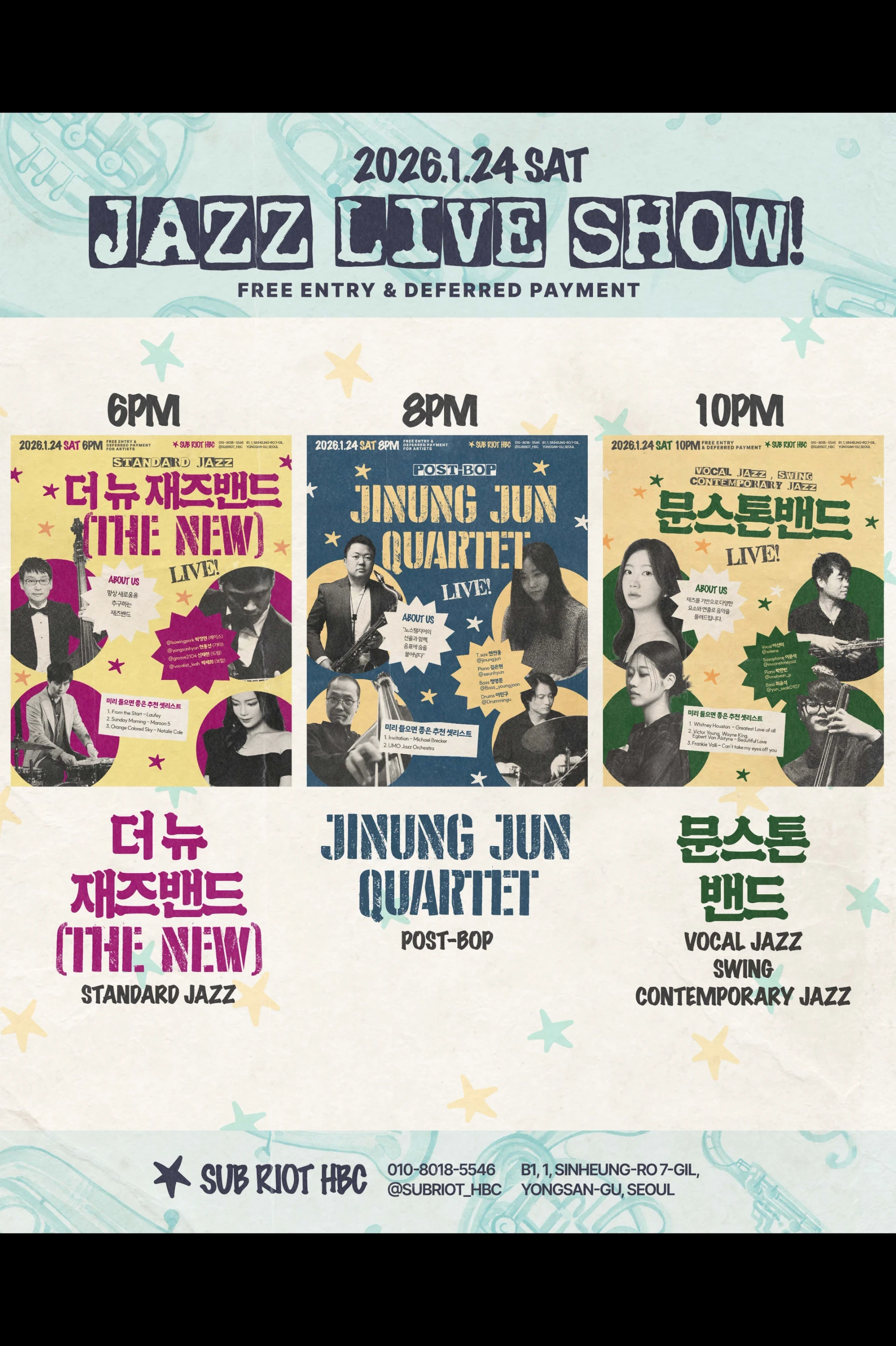 해방촌 서브라이엇 HBC 에서는 토요일 즐거운 재즈 공연이 함께 합니다~ 재즈와 함께 하는 즐거운 시간 놓치지 마세요^^
